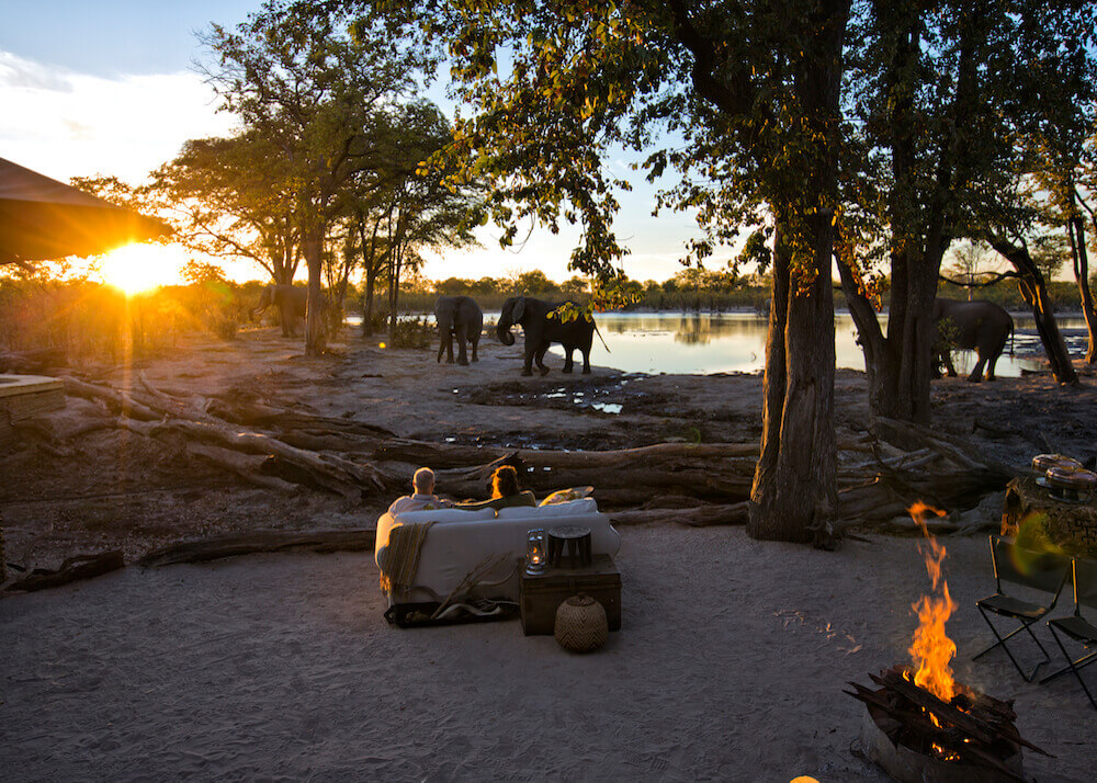 Amble down to the heart of the camp, and you’ll find the dining deck and lounge areas. Keep an eye on the comings and goings at the waterhole from a slouchy sofa, or float in the mini-splash pool and watch the wildlife doing the same below. Meals are wholesome and tasty, and after you’ve finished munching, the night is best spent in the open-air boma with a nightcap (or two or three). When darkness falls, the waterhole is illuminated and all its David Attenborough-esque action, sadly without the voiceover.