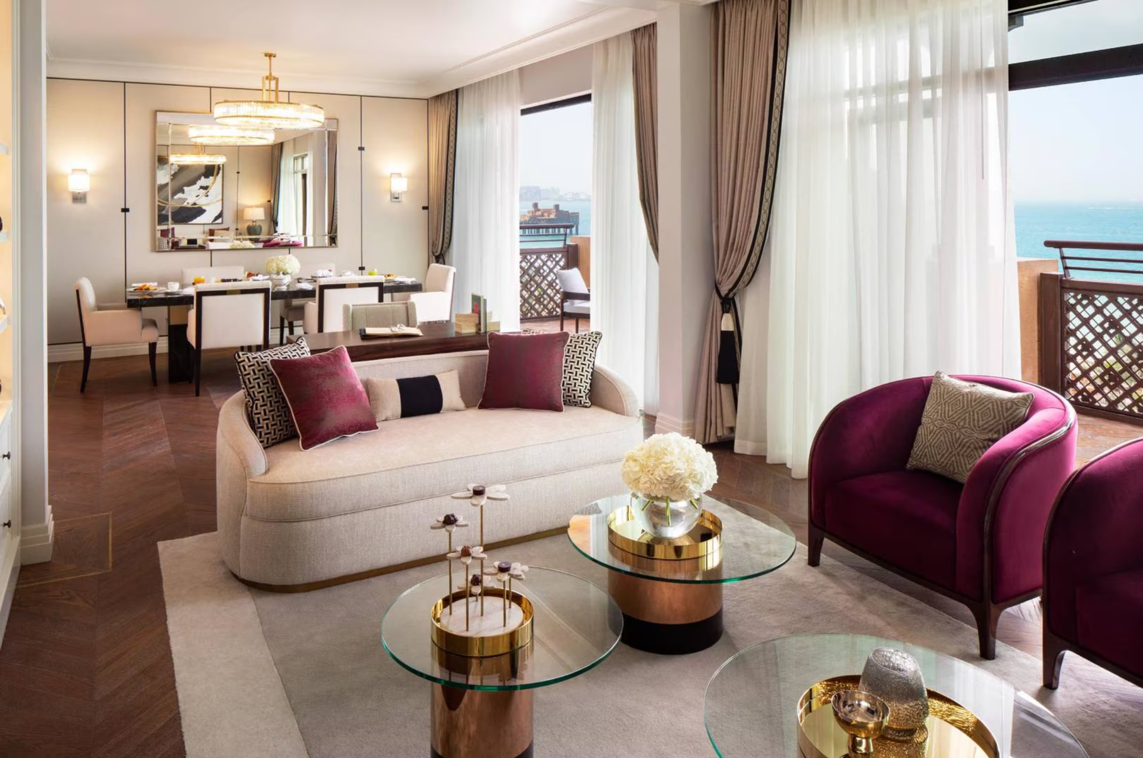 Prestigious living with azure blue sea views. 212 sqm – with a 131 sqm balcony. Highlights include indoor and outdoor living and dining areas, two grand Arabic-style marble-clad bathrooms with a walk-in rainfall shower and a large circular Jacuzzi bath.