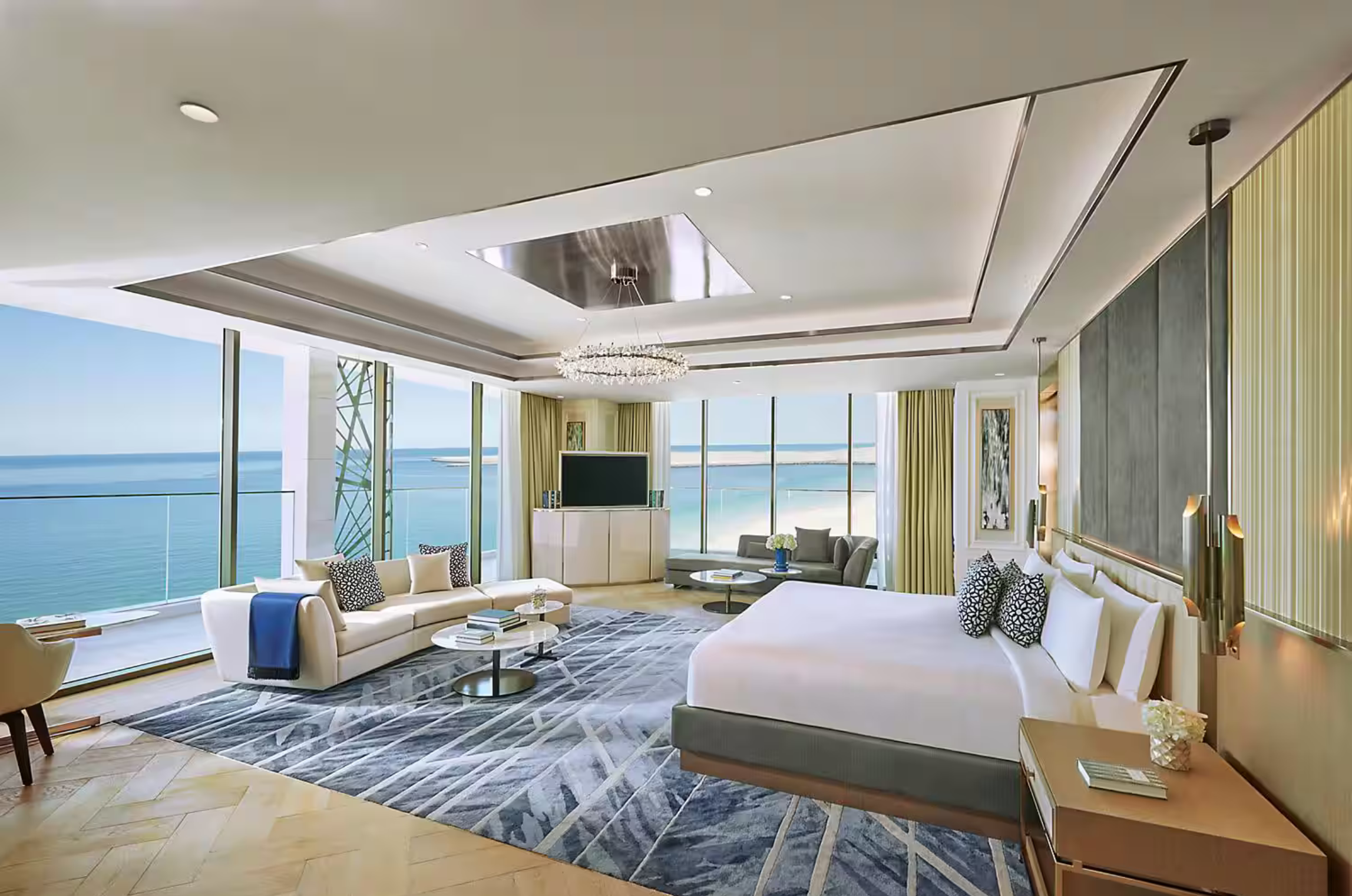 Overlooking the Arabian Gulf, this spectacular suite features spacious living and dining rooms as well as several private balconies.
