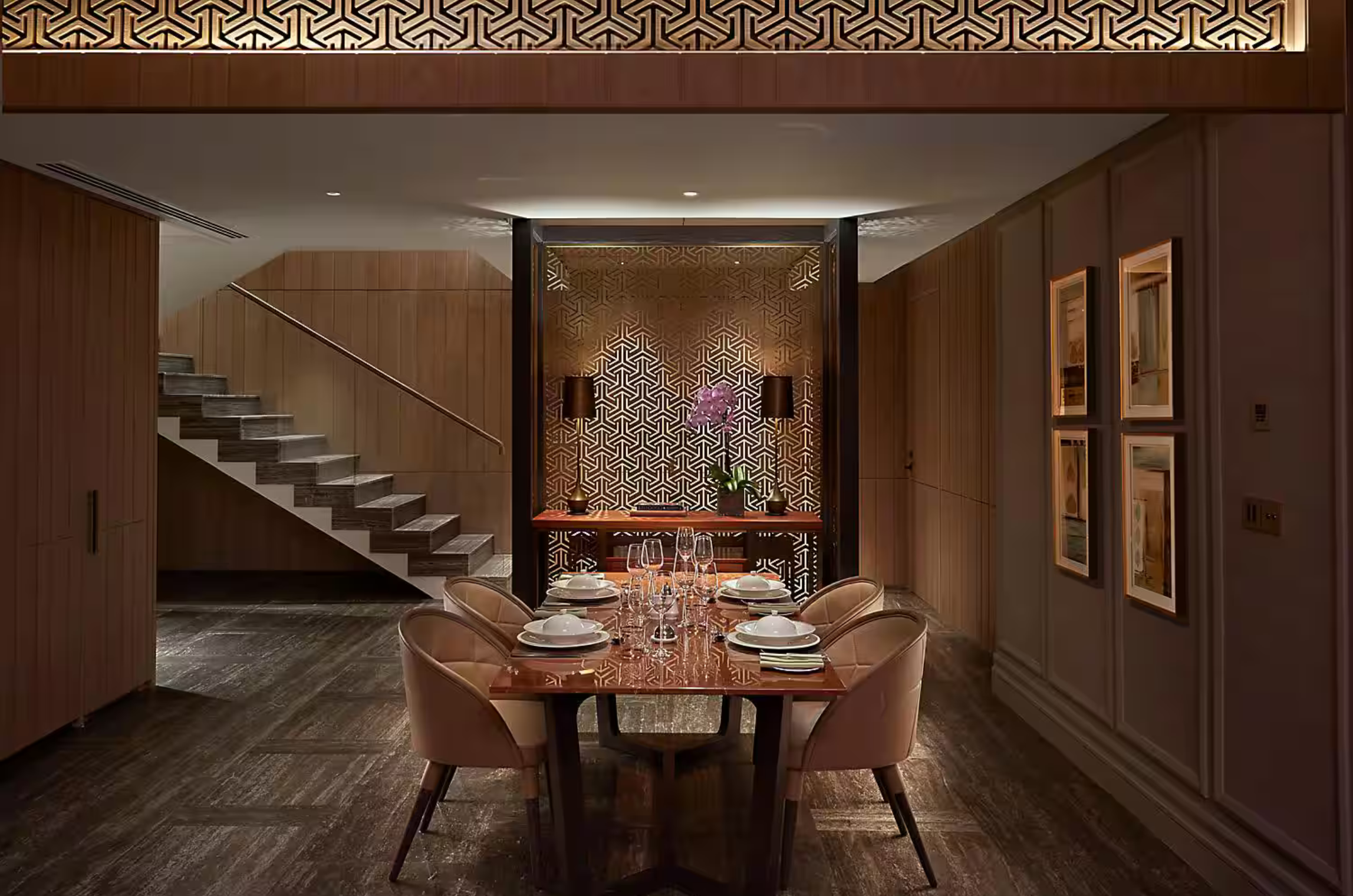 Luxuriously appointed with an oak-panelled foyer and furnishings including a mother-of-pearl inlaid black lacquer chair, this beautiful room enjoys impressive views of the city’s dramatic skyline.