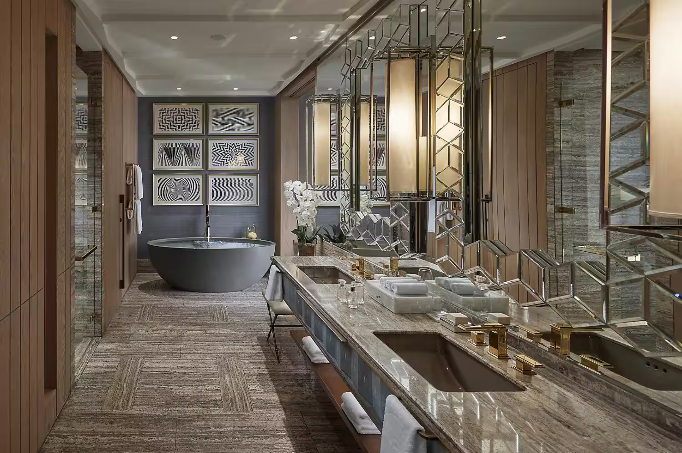 With a private balcony and a separate living room with a dining area, this spacious suite features a large master bedroom with a king-size bed. Flooded with light from floor-to-ceiling windows, views stretch out over the city skyline.