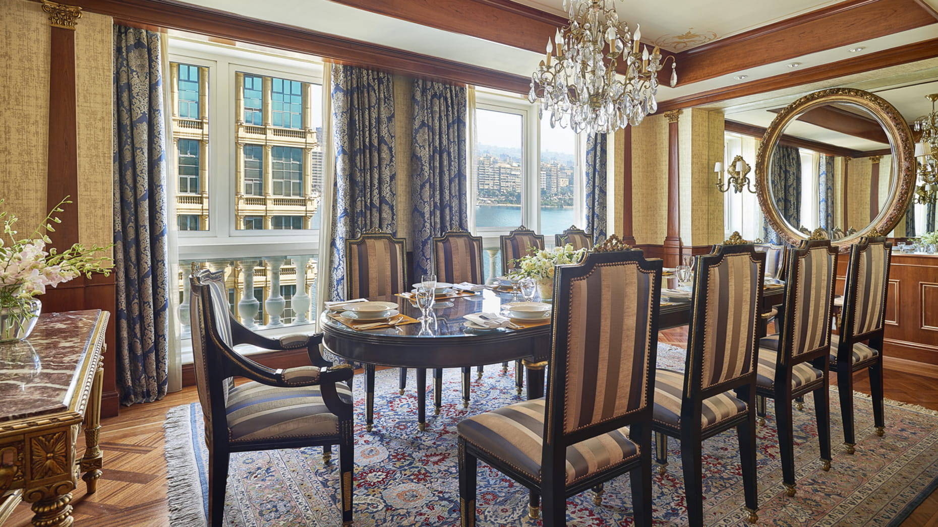 Perched high on the 15th through 18th floors, the 252 m2 Presidential Suites are bathed in natural light from the floor-to-ceiling windows that offer 180Ëš views of Cairo at almost every turn. Original artwork hangs on the walls, and gleaming hardwood floors lead you through the living and dining rooms, study and three Empire-style bedrooms. Featuring a private terrace, luxurious marble bathroom with double vanity and a full kitchen, this suite accommodates up to nine.