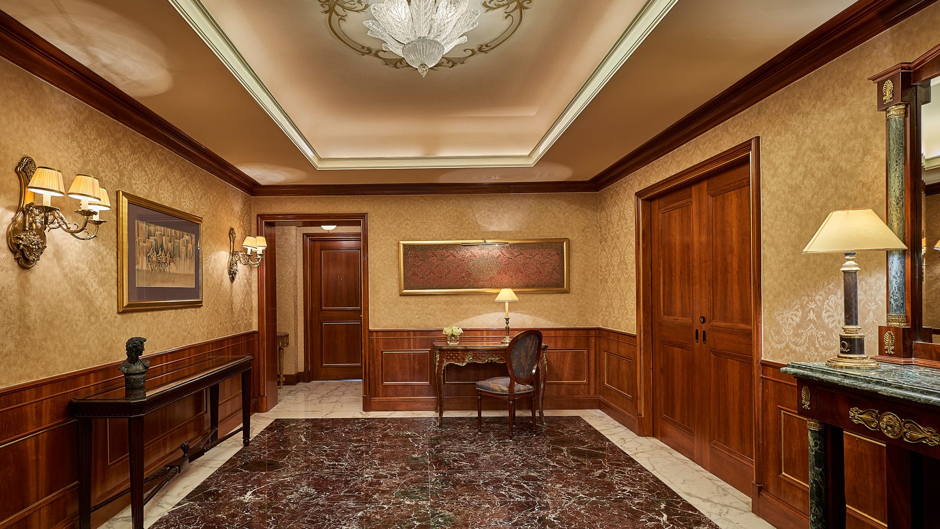 An open floor plan with inviting living and work areas outfitted in elegant French Empire-style furnishings make these rooms a favourite of extended-stay guests. With one full marble bathroom with deep soaking tub, one king or two twins, and one rollaway or one crib, these rooms accommodate three guests at 54 – 58 m2.