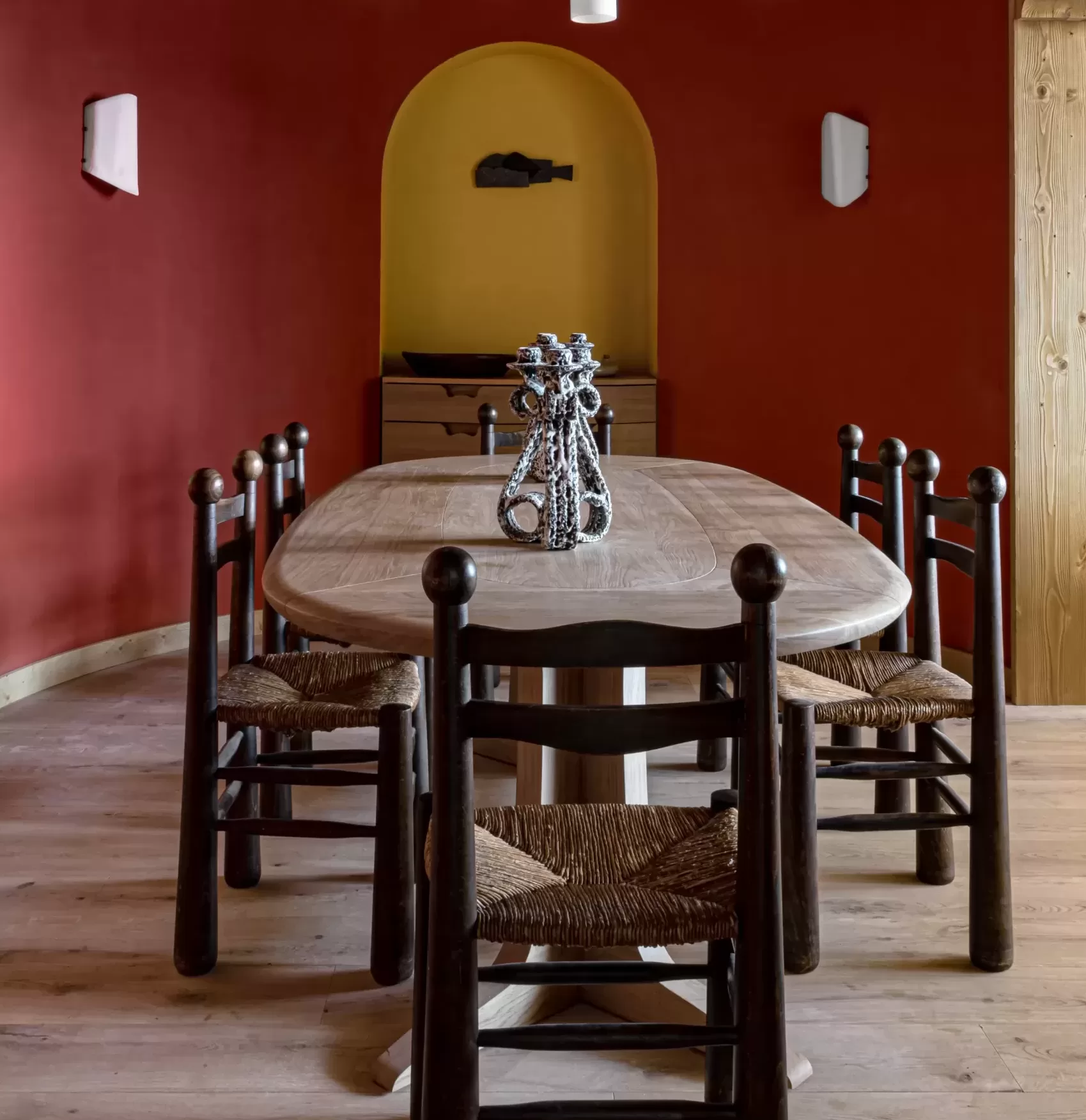 Le Coucou boasts two heated pools—one indoors with a Jacuzzi in the wellness area and the other outdoors on a vast terrace facing the snow-covered mountain. Connected seamlessly by a bay window, the indoor pool, adorned with arches, creates a trompe-l’oeil effect that extends the sense of space to the outside.