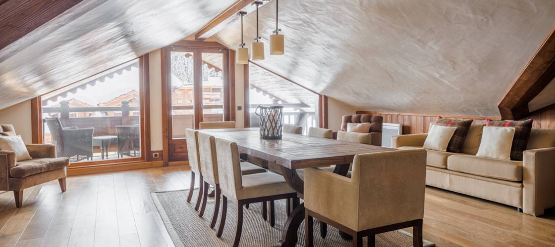 Loft 3 sleeps six adults comfortably with three double or twin rooms. There is an additional sofa bed on the mezzanine level of this apartment, which can sleep up to two extra guests. Split over two floors, this duplex Loft has a large sitting area with roaring fire, a mezzanine level with sofas, a dining table which can sit up to ten and a kitchenette with bar – plenty of space to relax after a long day on the ski slopes! Double doors open up onto a large balcony with views of Courchevel Moriond and beyond.