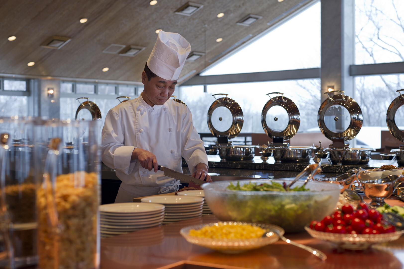 The main restaurant Goshiki serves delicious dishes, created with local produce and seafood in international style or Japanese fusion. The five-coloured buffet, which is handmade by the head chef, fuses the world and Japan to deliver a variety of flavours and unique tastes. The spacious dining space with high ceilings welcomes guests with spectacular mountain views and a fireplace, and the seating arrangement is designed to accommodate groups.