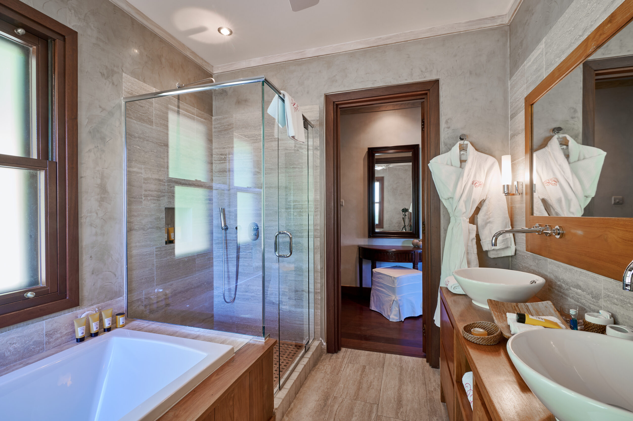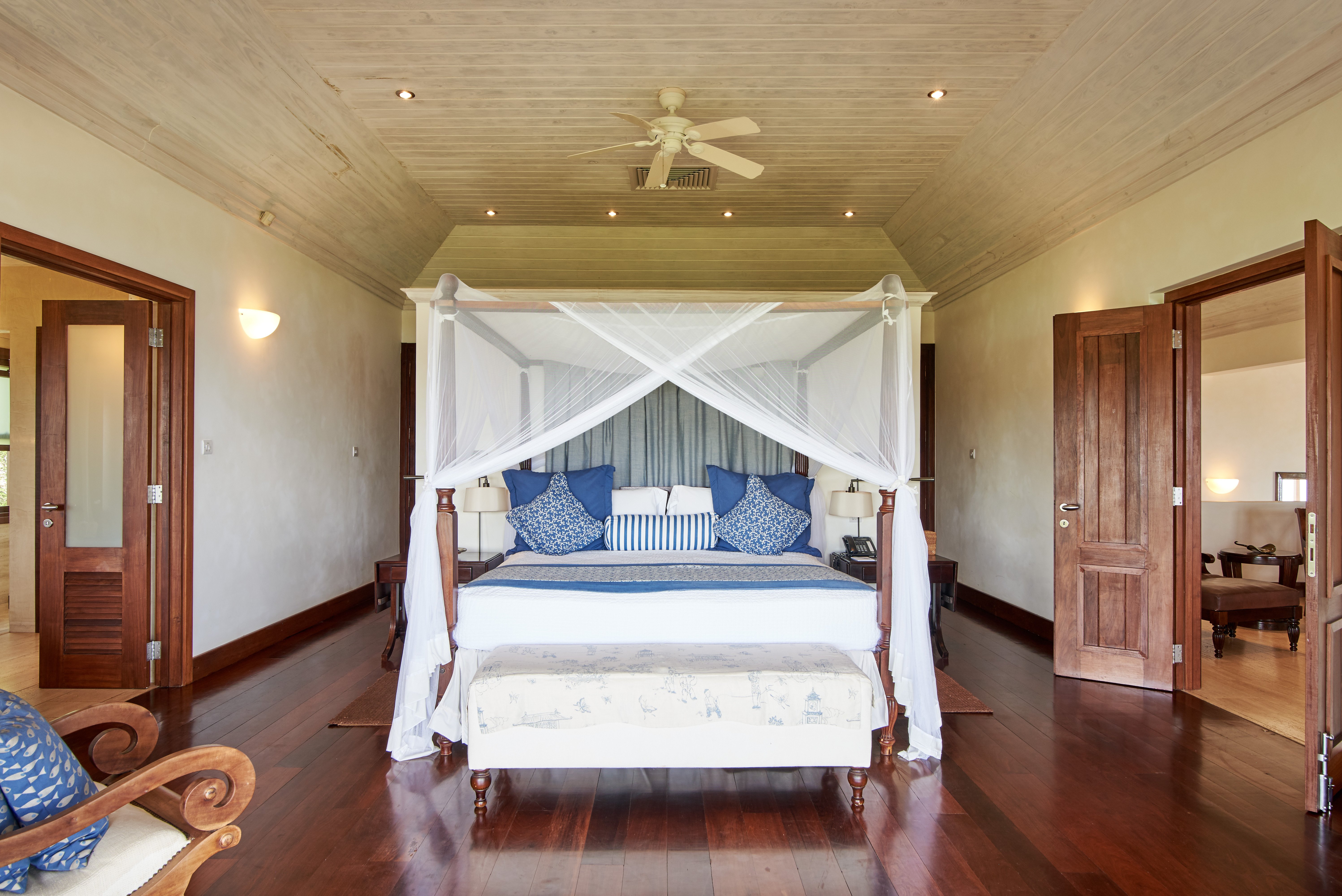 Single story spacious Caribbean inspired suites, featuring one or two bedrooms with a separate sitting area and outdoor patio. Bedrooms have a full en-suite bathroom with double vanity, bath and separate walk-in shower, luxurious Acqua Di Palma toiletries and walk-in closet. Each suite also features an additional full bathroom. The suite is fully air-conditioned, with ceiling fans, mini-bar stocked with non-alcoholic drinks, tea and coffee making facilities, safe, telephone and hairdryer.